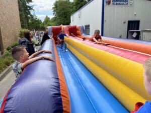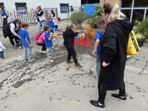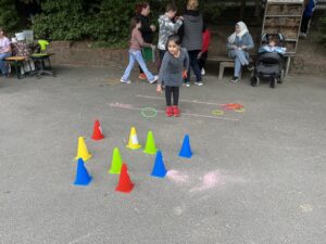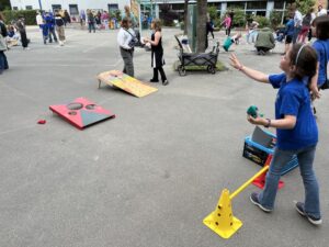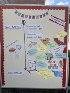 Nach der Begrüßung aller Gäste mit unserem Schullied wurde das Buffet eröffnet und alle aßen gemeinsam. Danach ging es mit den Spielen los. Alle Kinder, auch unsere kleinen und größeren Gäste, erhielten eine Laufkarte für den Stationenlauf der Spiele in den Klassen. Trotz der diesmal etwas beengteren Umstände wurden die Spielstationen sehr gut genutzt und alle hatten viel Spaß.